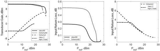 Concerning the input-matching, Figure 5 (left) shows the input reflection coefficient in the three analysed cases. For the quasi-linear stages, varies mildly with the input power, confirming that the stage can be matched at the input port over the whole power range without significant loss of gain. On the contrary, the input reflection coefficient of the DohertyC case shows a significant variation from back-off to saturation. Figure 6 shows the transducer gain and the input return loss resulting when the three stages are input-matched at the highest output power level (High-Power Matching (HPM)), i.e., the generator impedance of Figure 2 is the conjugate of the impedance AB-HPM (Figure 5, left) for classAB and DohertyAB, and of the C-HPM load for DohertyC. In back-off, the classAB experiences an input return loss of only 0.26 dB and the resulting transducer gain is maximally flat, since the mismatch in back-off compensates the gain compression at high power. The DohertyAB stage in back-off has a more significant return loss (0.5 dB) which, although mild, is important when designing the Doherty stage, since in back-off the Doherty amplifier gain is dominated by the DohertyAB behavior.