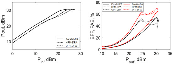 (left), efficiency (right, red) and PAE (right, black) for HPM-DPA, OPT-DPA and Parallel-PA cases.