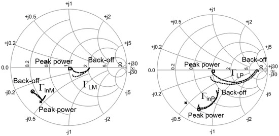 To understand this behavior, Figure 9 (right) reports the curves of the MAIN and AUX stages separately. Notice that here, the plot is against the available input power of the two stages. Clearly, the AUX of the HPM-DPA turns on later than the OPT-DPA one, due to the higher input mismatch in back-off; see Figure 10 (right). The late AUX turn-on, along with the slow gain expansion of the class C gain (Figure 4), mean that the AUX stage is not efficient in load-pulling the MAIN amplifier. The MAIN gain, in turn, starts to compress because of the knee voltage increase, resulting in a sharp reduction in the overall gain in the Doherty region. This effect is made worse in the HPM-DPA case by the worse mismatch in back-off. The HPM-DPA performance also worsens in terms of linearity, since the power gain continuously degrades in the Doherty region: in fact, as already observed in Figure 8, the AUX stage does not reach the load and the input matching is poor even at peak power; Figure 10 (right). On the contrary, the OPT-DPA stage is well-matched at high power (Figure 10, right) due to the good landing of onto .