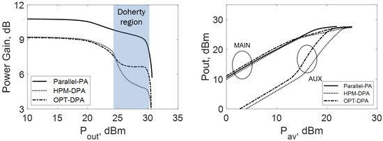 Despite their good performance, the HPM-DPA and the OPT-DPA differ in terms of gain and PAE. Figure 9 (left) shows the power gain: overall, the Doherty amplifiers show a low gain with respect to the Parallel-PA case, and the gain loss is especially noticeable in the Doherty region. Moreover, in the Doherty region, the HPM-DPA exhibits a lower gain than the OPT-DPA, although in back-off the two amplifiers behave in the same way.
