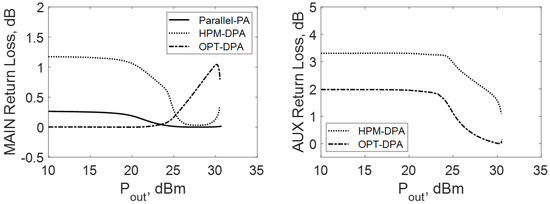 Input return loss of the MAIN (left) and AUX (right) stage for HPM-DPA, OPT-DPA and Parallel-PA cases.