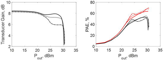 Transducer gain (left), efficiency and PAE (right) for three values of the AUX input phase: (solid line); (dotted line); (dashed line).