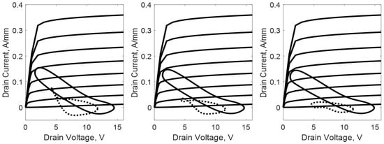 A first demonstration of the TCAD simulation of the Doherty stage of Figure 3 in low-frequency conditions was given in the pioneering paper [30], where a preliminary analysis could identify the AUX optimum bias for class C operation, shown in Figure 1 (blue marks), corresponding to V. The same is adopted in this work.