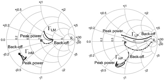 Following the results presented in Section 3, we identify two possible Doherty configurations that differ only in the input-matching and will be compared in the following. The first choice is to input match both the AUX and MAIN to the AB-HPM load shown in Figure 5. This corresponds to a sub-optimum choice, since only the MAIN amplifier is matched at peak power. We refer to this DPA as the “HPM-DPA case”. In the second DPA, the MAIN amplifier is input matched in back-off ( is conjugate of D-LPM load of Figure 5), while the AUX amplifier is input matched at peak power (i.e., is conjugate to C-HPM of Figure 5). We refer to this DPA as the “OPT-DPA case”. Since the input reflection coefficient of the D-LPM and C-HPM loads have similar amplitudes but differ in phase by , the phase of the AUX input voltage generator is changed with respect to the value, akin to an input offset line, and set to . This allows for the gate voltages of the MAIN and AUX stages to be in the correct phase for the Doherty operation. Finally, a conventional power amplifier parallel combining two identical class AB stages (hereafter the “Parallel-PA case”), loaded on optimum power load and input matched to AB-HPM was simulated for comparison with the Doherty stages.