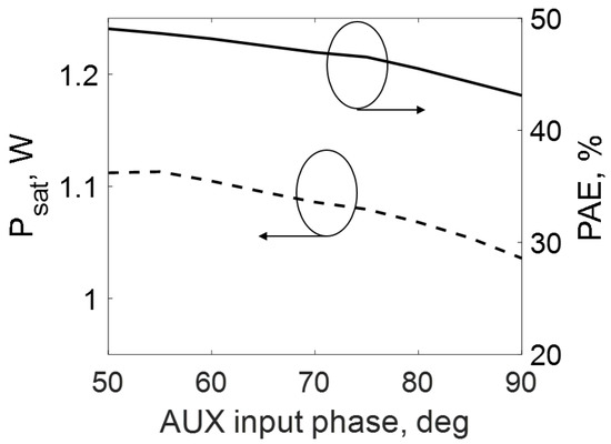 DPA-saturated output power (solid line) and peak efficiency (dotted line) as a function of the AUX input phase.