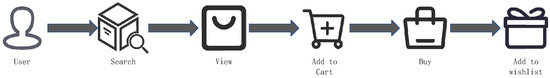 Multi-behavior recommendation is an emerging branch in the field of recommender system research, which aims to utilize multiple user behavior data to improve the recommendation performance for target actions [7]. In the traditional recommendation model, only one kind of user-item interaction behavior is used, while the multi-behavior recommendation mainly utilizes multiple types of user behaviors to improve the recommendation performance of the target behavior [8]. For example, in Figure 1, when shopping, users will generate various user behaviors, such as searching for products, viewing products, adding to the shopping cart, purchasing products, and collecting products. However, traditional recommendation algorithms mostly only use purchase behavior information and do not fully utilize other user behavior information generated by users during the purchase process.