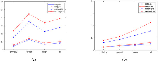 From Figure 2a,b, we can intuitively see that adding user behavior can indeed improve the experimental results on both the Beibei and Taobao datasets. Moreover, different user behaviors have different impacts on the experimental results. From the Beibei dataset, it can be found that blindly increasing user behavior does not always improve the experimental results. On the Taobao dataset, increasing user behavior can improve the experimental results. In summary, it can be concluded that increasing user behavior can indeed improve the experimental results to a certain extent, but may not continue to improve. The reason may be related to the quality of the dataset.