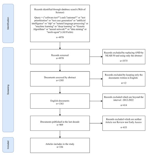 (“software test*”) near/50 (“automat*” or “test prioritization” or “test case generation” or “artificial intelligence” or “nlp” or “natural language processing” or “machine learning” or “deep learning” or “genetic algorithms” or “neural network*” or “data mining” or “multi-agent”) (abstract) and english (language) and 2012–2022 (year published) and article or review (document type) not early access (document type).