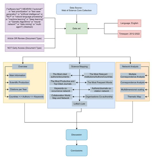 Data mining and multi-agent systems are also used in software testing. In order to evaluate association rules among software testing metrics, data mining is utilized as a technique [], or it can be used to automated regression testing of data-driven software systems []. Multi-agent systems can collaborate to finish creating the test data for software []. Another approach is developing a multi-agent testing framework []. Moreover, an adaptive test automation model is a potential application. This model integrates the study of test requirements, building and executing test cases. Additionally, it can also plan and carry out tests, reporting and analyzing defects []. Researchers, scientists, and graduates could profit from a bibliometric analysis by employing it to decide more effectively in their disciplines according to different properties and to encourage future studies in domains that require it.