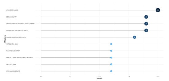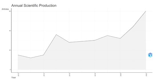 We used the Bibliometrix R Package (biblioshiny v4.0.1) software to do a thorough scientific mapping analysis after exporting the dataset from the WoS Database [] in order to generate most of the graphs, and we used VOSviewer, a free computer tool for creating and viewing bibliometric maps [], for the rest of the graphs.