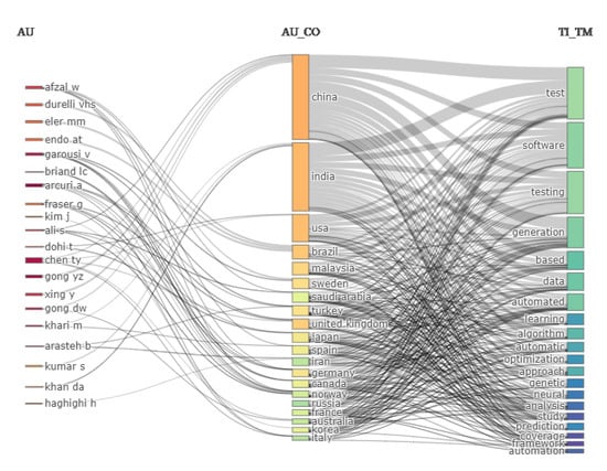 The three-field plots utilizing three key metadata fields offer valuable insights on the connection between domains, such as linking authors’ work to specific keywords and countries involved in the research field; an example of this would authors Arcuri, A., and Gong, Y.Z., from Norway, and China respectively had the greatest influence on the study of intelligent software testing. Our findings also point to a close connection between the topic studies in China, India, and the USA.