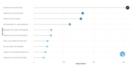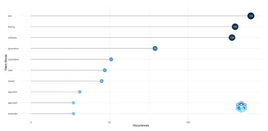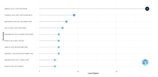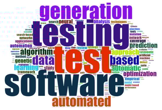 This is the first bibliometric study, that we are aware of, that evaluates the results of intelligent software testing. Nevertheless, there were other scholars who treated this subject as a systematic literature review [,,], or as a simple review of the literature [,]. As we’re zooming out, we find some articles focusing on summarizing the bibliometric data like [,]. Some of them were doing systematic reviews specializing in a single type of software tests: like Higher order mutation testing [], or software testing in general like []. A few scholars focused on examining reviews that help to synthesize indexes that makes it easier to discover the most pertinent data from secondary studies, encouraging the use of proof decisions in any specific field of software engineering []. Another type of reviews were those related to automation, in order to evaluate its benefits and limitations [], or knowing when and what to automate [], or the challenges facing its automation [].