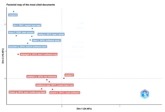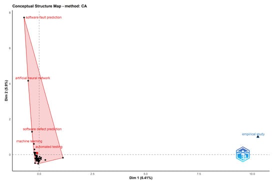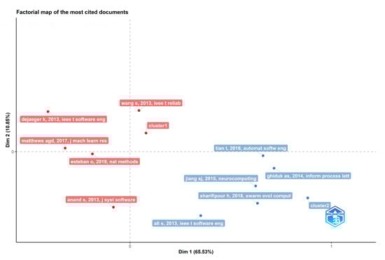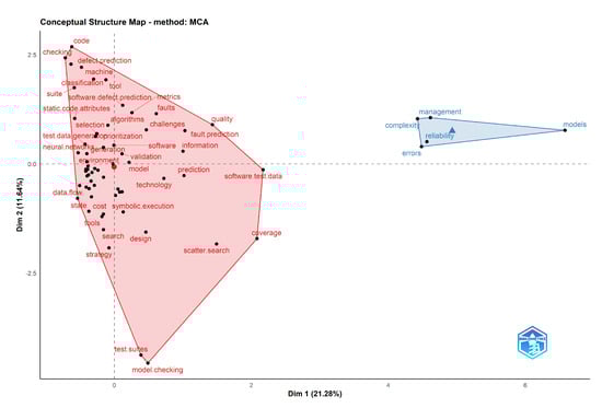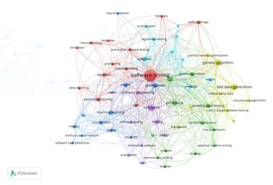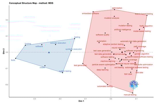 In Figure 29 and Figure 30, the topic dendrogram and the conceptual structure map were generated based on the author’s keywords of each paper. The y-axis represents the distance between the words. Each group of words represents the same topic. We have two clusters of words: Cluster 1 with 8 words related to the field of software testing, verification, reliability, and performance. Cluster 2 has 44 words related to software testing techniques and multiple artificial intelligence algorithms.