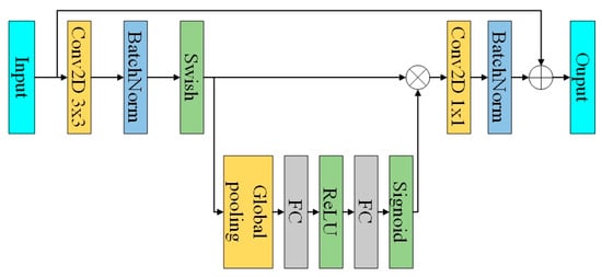 EfficientNetv2 [] is a smaller and faster network model proposed by Quoc V.Le and others in 2021 to solve the problems of EfficientNet. It also has a faster training speed. EfficientNetv2 is mainly constructed by stacking an inverted linear bottleneck layer with depth-wise separable convolutions (MBConv, as shown in Figure 3) and an inverted fusion residual layer (Fused-MBConv, as shown in Figure 4). The MBConv structure first performs a dimensionality boosting convolution and then uses the depth-wise separable convolution to greatly reduce the number of parameters. Finally, the Squeeze-and-Excitation (SE) module is used to obtain the attention weights, so that the network pays more attention to the useful information in the feature map.
