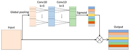 In our proposed method, we modify the SE [] attention module. Since the dimension reduction operation of SE attention will lead to the loss of some important feature dimensions, we abandon the idea of its own dimension reduction before dimension increase and directly use one-dimensional convolution operation to operate on the global pooling features without dimension reduction, so as to obtain its cross-dimensional related information. Finally, the attention weights are obtained through the Sigmoid layer, so that the modified attention module can obtain more accurate attention weights. The attention module structure used in this paper is shown in Figure 8. First, the features are globally pooled to obtain global information, and then the cross-dimensional related information is obtained by using two layers of one-dimensional convolution operations. Finally, the attention weights are obtained by using the Sigmoid function.