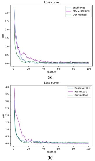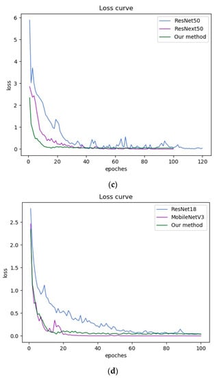 The loss function of each model during training is shown in Figure 10, where (a) is the comparison of our method with the loss function of EfficientNetv2-s and ShuffleNet, (b) is the comparison of our method with the loss function of ResNet101 and DenseNet121, (c) is the comparison of the loss function of our method with ResNet50 and ResNeXt50 and (d) is the comparison of the loss function of our method with ResNet18 and MobileNetV3. All the loss functions were cross-entropy loss functions.
