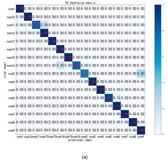 The confusion matrix of some models’ test results on the test set is shown in Figure 12, where (a) is the confusion matrix of our proposed methods, (b) is the confusion matrix of the EfficientNetv2-s, (c) is the confusion matrix of MobileNetv3, and (d) is the confusion matrix of ResNet18. In the confusion matrix, darker colors have higher values. It can be intuitively seen from the confusion matrix that our method can achieve accurate classification of various types of radar signals.