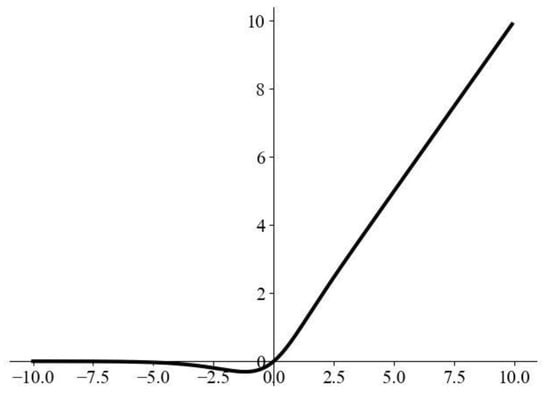 The Mish activation function is unsaturated [42] and has no upper bound, which helps to avoid the problems of gradient disappearance or explosion caused by saturation, resulting in significantly improved training speeds. Additionally, it has a small weight and a lower bound on the negative axis, which helps to prevent the neuron necrosis phenomenon associated with the ReLU function and produces a strong regularization effect. The function is nearly smooth at every point, making it easier to optimize and more generalizable, and it facilitates the flow of information in deeper networks. The Mish activation function is widely used in YOLOv4 [43], demonstrating a 0.494% improvement over Swish and a 1.671% improvement over ReLU. Figure 7 illustrates the graph of the Mish function.