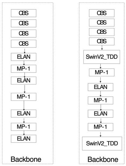 Based on the characteristics of SwinV2_TDD and MFSA, two ELAN modules in the backbone network of YOLOv7 are replaced with SwinV2_TDD modules, combining the strong modeling capability of the transformer structure with important visual signal priors. Meanwhile, the MFSA mechanism is introduced to enhance the extraction of small-scale features in the image. The original backbone and enhanced backbone structures are shown in Figure 8.