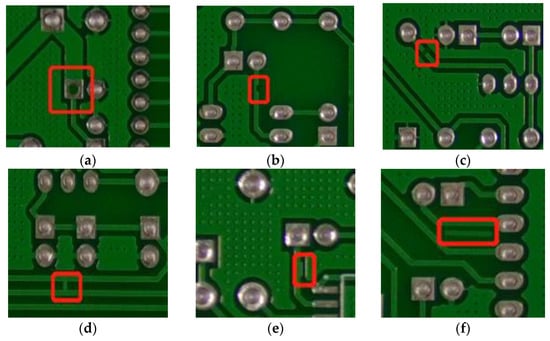 Sample test results: (a) missing hole; (b) mouse bite; (c) open circuit; (d) short circuit; (e) spur; (f) spurious copper.