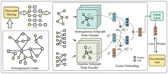 Some researchers use a metapath to find the neighbor nodes of the target node and encode the target node by aggregating the information of the neighbor nodes and metapaths. Taking the idea of the GATs algorithm [23] on homogeneous graphs, the HAN algorithm obtains the embedding of a target node by fusing the information of neighbor nodes and metapaths through a node-level and semantically level attention mechanism [24]. Based on the autoencoder model SDNE [25] on the homogenous graph, the BL-MNE algorithm was proposed to learn the embedding of nodes on the basis of investigating the first-order and second-order adjacency relations in the metapaths [26]. Referring to the representation-learning algorithm DGI [27] on the homogeneous graph, the HDGI algorithm uses the graph convolution module and semantic-level attention mechanism to capture the metapath information to achieve node embedding [28].