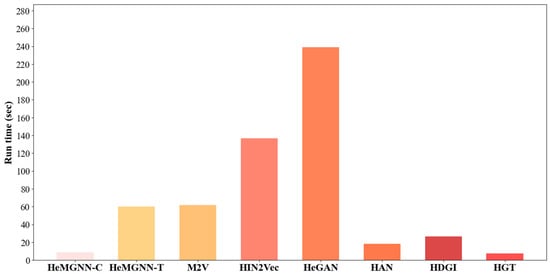 It can be seen that among all the models, the HeMGNN-C model and the HGT model need the shortest running time. The HGT model directly aggregates the information of neighbor nodes to encode target the nodes, resulting in a small architecture and fast training speed. Although the HeMGNN-C model also trains fast because it uses a sparse matrix for operation, it is based on metapaths to obtain the adjacency relationship between nodes. The training speed of the HeMGNN-T model is slower than that of the HeMGNN-C model, and the baseline models of HGT, HAN, and HDGI. It is because HeMGNN-T uses a random initialization to generate the initialization vector of nodes, and the subsequent matrix operations are based on the dense matrices, which brings HeMGNN-T a higher time consumption in matrix operations. Among the baseline models, the HIN2Vec model and the HeGAN model have the longest time consumption. HIN2Vec requires the input of the relationships between nodes generated by random walking for model training, which results in a longer running time. The HeGAN model takes a Generative Adversarial Network (GAN)-based architecture, it needs more time to train the generators and discriminators. In summary, compared with the baseline models, the HeMGNN model not only performs well in downstream classification and clustering tasks, but also has higher advantages in running time.