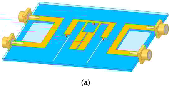 The traditional method to improve filter selectivity is to introduce an additional transmission path, which can generate transmission zeros. However, the size of the designed filter will increase. In this paper, the electromagnetic coupling method is used to introduce an extra transmission path while keeping the filter size unchanged. The 3D and plane structure of the designed balanced BPF is given in Figure 1. The yellow block stands for the microstrip line on the top surface of the substrate, whereas the white block and the blue block represent the slotline and ground on the bottom surface, respectively. It can be observed that the proposed component is composed of two quarter-wavelength SIRs, U-type microstrip–slotline transition structures and L-type microstrip–slotline transition structures. Generally, the design of a balanced component can be divided into two parts: DM part design and CM part design.