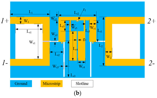 With the rapid development of modern wireless technologies, multiservice communication systems, such as 4G and 5G, have become widespread, and these systems will begin to interfere with each other. Recently, balanced circuits are increasingly coming into focus due to their better performance, which includes good noise immunity, low electromagnetic interference and easy connection with other balanced components or antennas compared to single-end circuits [1,2]. Balanced bandpass filters (BPFs) can achieve high common-mode (CM) rejection according to the relevant research. Several balanced BPFs with improved CM suppression were designed in [3,4,5,6,7]. In [3], a balanced BPF was designed by using a center-loaded half-wavelength resonator in 2010. However, its differential-mode (DM) passband selectivity and CM rejection could be improved further. In [4], a low-loss wideband differential BPF was presented by using a pair of multilayer differential microstrip–slotline transitions and microstrip line resonators. However, the proposed BPF is difficult to fabricate and expensive. A balanced filter with a broadband DM transmission and a good CM block was fabricated based on a slotline resonator in [5], but the selectivity of the DM passband could be improved further. Recently, a compact second-order balanced BPF with high selectivity was presented based on magnetically coupled resonators in [6]. However, the DM stopband is narrow. In [7], an ultra-band BPF DM passband was achieved by employing an H-type slotline structure. In order to improve selectivity, a source-load coupling was introduced. Meanwhile, one more layer of substrate was employed to reduce the DM passband insert loss. Unfortunately, the CM suppression could be improved further. In [8,9], a balanced BPF was achieved based on right-angled isosceles triangular patch resonators and half-wavelength folded S-shaped slotline resonators, respectively. However, balanced BPFs with a compact size, good DM selectivity, low insertion loss and high CM suppression are still demanded.