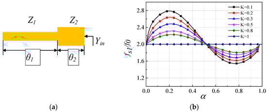 A common SIR is composed of one high-impedance section and one low-impedance section, where Y1, Y2 and θ1, θ2 represent the characteristic admittance and electrical length of each stub, respectively, as shown in Figure 2a. The input admittance can be concluded as [10]