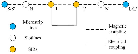 The simplified coupling topology under DM signal excitation is shown in Figure 3, in which the blue circles, S/S′ and L/L′, represent the microstrip transmission lines with a characteristic impedance of 50 Ohm; the white circles, N and N′, denote the slotline; and the yellow circles, l and l′, represent SIRs. The coupling between the microstrip transmission line and slotline is magnetic field coupling. However, there are two kinds of couplings between the two SIRs. The first kind of coupling is electrical field coupling, which is achieved by the parallel coupling between the low-impedance sections of SIRs. The second kind of coupling is magnetic field coupling, which is realized by a metallized vie hole between the high-impedance parts of SIRs. Figure 4 shows the electrical field and magnetic field distributions of the two SIRs at 2.47 GHz, which are achieved in EM simulation software HFSS. It can be seen that the electrical field coupling between the low-impedance parts of SIRs is strong, while the electrical field coupling between the high-impedance parts is weak at 2.47 GHz. Meanwhile, the magnetic field coupling between the high-impedance sections of SIRs is strong, while the magnetic field coupling between the low-impedance parts is weak at 2.47 GHz, which validates the aforementioned analysis. The electrical field coupling can be controlled by the gap between the low-impedance parts of SIRs, while the magnetic field coupling can be controlled by the diameter of the metallized via hole. The coupling between the slotline and microstrip line occurs by means of the magnetic field. The slotline, which is etched on one side of the substrate, is crossed at a right angle by a microstrip conductor on the opposite side. The microstrip and slotline extend about one quarter of a wavelength beyond the crossing point. To reduce the size, the extended quarter-wavelength open-circuit branch can also be replaced by a short-circuit point.
