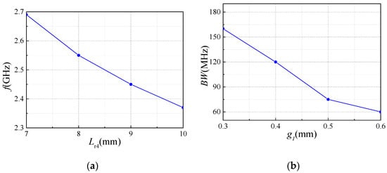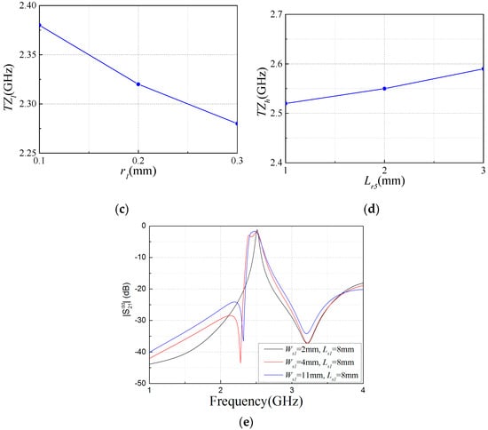 The performances of the DM and CM frequency characteristics of the proposed balanced filter with different dimensions are also analyzed by HFSS 13.0. As observed in Figure 5, the center frequency, bandwidth and the positions of TZ can be controlled by adjusting the dimensions. As observed in Figure 5a,b, the center frequency of the proposed balanced BPF is decreased when Lr4 is increased, and the bandwidth is decreased when g1 is increased. For the coupling resonators, the electrical coupling and magnetic coupling can be achieved by the gap between the high-impedance sections of SIRs and the metallized via hole. Due to the cancellation effect of the electrical coupling and magnetic coupling, TZl (the first transmission zero) is realized in the lower passband. Due to the U-type microstrip–slotline transition structure, TZh (the second transmission zero) is generated in the upper passband. Therefore, the selectivity of the DM passband can be improved greatly. As shown in Figure 5c, the position of TZl is controlled by changing r1. Meanwhile, TZh is moved to high frequency when Lr5 increases, as observed in Figure 5d. In addition, step impedance slotline structure is used to achieve the miniaturization of the proposed balanced BPF. Additionally, the impact of slotlines’ width and length on the transmission performance is shown in Figure 5e. Therefore, the DM performances of the proposed balanced filter can be independently controlled by the related parameters.