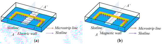 A slotline is a planar transmission structure first proposed by Cohn in 1968, which consists of a narrow slot etched in the metallization on one side of a dielectric substrate. The metal on the other side of the substrate is removed. This geometry is well suited for applications in microwave-integrated circuits. The slotline, which is etched on one side of the substrate, is crossed at a right angle by a microstrip conductor on the opposite side. The microstrip extends about one quarter of a wavelength beyond the slot. The transition can be fabricated using the usual photoetching process and is thus easily reproducible. Additionally, as the microstrip part of the circuit can be placed on one side of the substrate and the slotline part on the other side, this transition makes two-level circuit design possible. Coupling between the slotline and microstrip line occurs by means of the magnetic field. A balanced U-type microstrip/slotline transition, as depicted in Figure 6, comprises a U-type stepped-impedance microstrip feedline and a slotline resonator. The slotline resonator is etched on the bottom ground and the U-type microstrip line is on the top side of the substrate. The width and length of the slotline will influence the conversion efficiency from microstrip line to slotline, i.e., the insertion loss of the bandpass filter. Generally, the slotline extends about one quarter of a wavelength beyond the intersection of microstrip lines and slotlines. The electric field distributions excited by DM and CM signals in U-type microstrip–slotline transition structure are shown in Figure 6, in which the red arrow represents the electric field in microstrip line, the purple arrow represents the electric field in slotline and the symmetry plane is denoted by A-A′. When the balanced ports are excited by DM signals, the symmetric plane, A-A′, can be regarded as an electrical wall, as observed in Figure 6a. The DM signals along the U-type microstrip line can be converted easily into the slotline mode because of the strong magnetic coupling. However, when the circuit is under CM signal excitation, a virtual magnetic wall will be realized at the plane, A-A′, as observed in Figure 6b. Because the electric field of the slotline and the magnetic wall are vertical to each other, the CM signals cannot be coupled to the slotline. Moreover, the CM characteristic of the U-type microstrip–slotline transition structure is related to its own boundary condition and independent of the working frequency, as observed in Figure 7. Therefore, the design complexity can be reduced significantly. To reduce the size, the slotlines are designed as stepped impedance, and the specific dimensions are optimized by HFSS. The uniform-impedance slotline and the stepped-impedance slotline can both create good CM suppression. The length of the balanced microstrip–slotline transition structure can be effectively reduced by employing stepped-impedance slotline. Therefore, a stepped-impedance slotline structure is used to achieve the miniaturization of the proposed balanced BPF.