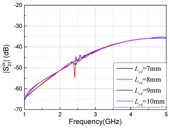 Simulated frequency responses with CM excitation of the proposed balanced filter for different Lr4. (W1 = 2.4, W2 = 2.4, L1 = 12.4, L2 = 16, Ws1 = 11.0, Ws2 = 0.2, Ws3 = 0.4, Ls1 = 8.0, Ls2 = 5.0, Ls3 = 13.0, Lr1 = 7.0, Lr2 = 16.0, Lr3 = 5.0, Lr5 = 2.8, Wr1 = 2.4, Wr2 = 1.0, Wr3 = 0.8, Wr4 = 2.6, r1 = 0.2 and g1 = 0.4. All values are in millimeters.)