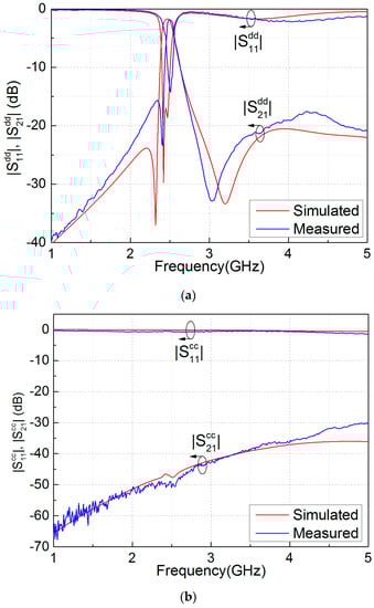 Comparisons between the simulated and measured results (narrowband): (a) DM responses; (b) CM responses. (W1 = 2.4, W2 = 2.4, L1 = 12.4, L2 = 16, Ws1 = 11.0, Ws2 = 0.2, Ws3 = 0.4, Ls1 = 8.0, Ls2 = 5.0, Ls3 = 13.0, Lr1 = 7.0, Lr2 = 16.0, Lr3 = 5.0, Lr4 = 9.6, Lr5 = 2.8, Wr1 = 2.4, Wr2 = 1.0, Wr3 = 0.8, Wr4 = 2.6, r1 = 0.2 and g1 = 0.4. all values are in millimeters.)