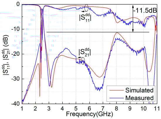 The photographs of the fabricated balanced BPF are shown in Figure 8. The substrate used in this design is F4BM (εr =2.2 and h = 0.8 mm). Due to the machining accuracy, there is a certain deviation between the simulation and the measurement. The effective size is about 43.4 mm × 20.9 mm (0.49λg × 0.24λg, where λg is the waveguide wavelength at 2.48 GHz). Figure 9 shows the simulation and the measurement. The measured S-parameters are carried out with an Agilent Network Analyzer N5230A. The measured DM center frequency is 2.48 GHz, with a 3-dB fractional bandwidth (FBW) of 4%. The measured minimum DM insertion loss for the center frequency is 1.74 dB, and the return loss is greater than 14 dB. Moreover, the DM stopband is extended to 10.8 GHz with a rejection level of 11.5 dB, which is 4.35 times the fundamental frequency, as shown in Figure 10. For the CM responses, a suppression of more than 40 dB can be achieved from DC to 6 GHz. Table 1 shows the comparison of the proposed balanced BPF with other proposed BPFs. It can be observed that the fabricated balanced BPF shows a better frequency selectivity of the DM passband and a higher CM rejection.