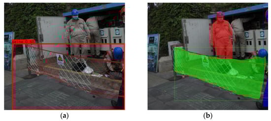 To avoid falling accidents, construction personnel must wear safety belts when working at heights, so the detection of safety belts is very important. However, because the area of the safety belt in the picture is small, the appearance of the safety belt is prone to change and it is easy to mistake the wire and cable, which are also irregular deformable objects, for the safety belt during detection. Therefore, the detection of safety belts is very difficult. The detection result is shown in Figure 16. The system can segment safety belts well.