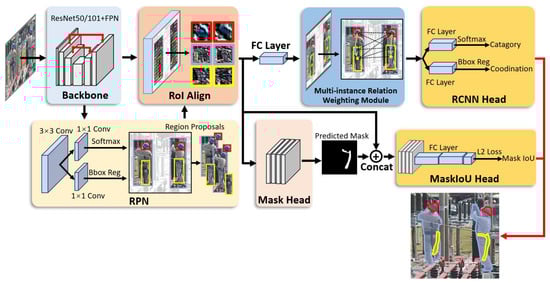 First, the input image is processed by the backbone feature extraction network to obtain the feature map. The Region Proposal Network (RPN) scans each position on the feature map by means of a sliding window to obtain independent Regions of Interest (RoIs). The RoI Align layer zooms the RoIs of different sizes into a unified size. The proposed multi-instance relation weighting module is added after the RoI Align layer, allowing each RoI to contain relation features between objects. Finally, the results output by the multi-instance relation weighting module are sent to the RCNN head, Mask head and MaskIoU head to get the accurate classification and segmentation results.