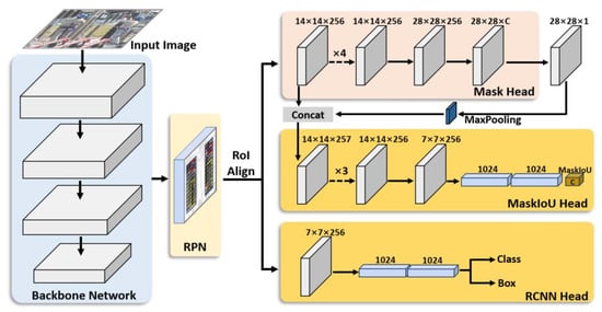 To improve upon Mask R-CNN, MS R-CNN calculates the Intersection over Union (IoU) between the predicted segmentation mask and the ground truth to obtain MaskIoU. MaskIoU and classification confidence are integrated to evaluate the mask segmentation results so as to improve the accuracy of image segmentation compared with Mask R-CNN. The corresponding approach in the network structure is to add the MaskIoU head. The structure diagram of MS R-CNN is shown in Figure 3.