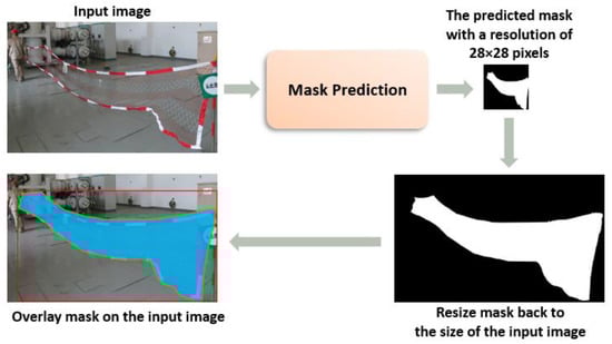 The Mask head is used to implement semantic segmentation tasks and obtain instance binary masks for each category. The Mask head is a seven-layer convolutional neural network that inputs positive samples selected by the RoI classifier and generates their masks. The resolution of the generated masks is 28 × 28 pixels, and the mask generation process is shown in Figure 4.