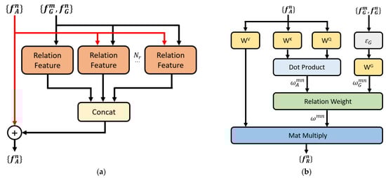 We consider all the objects with geometric features and appearance features [53]. is a 4D bounding box that contains information about the object’s coordinates . Meanwhile, the appearance features correspond to the region feature of RoI. The dimension of is determined by the learning task, such as a 1024-dimensional feature output from a fully connected layer. Specifically, represents the appearance feature of the nth object, and represents the geometric feature of the nth object. As a result, an input set containing objects can be represented as . The formula for calculating the relation feature of the entire set of objects is as follows: