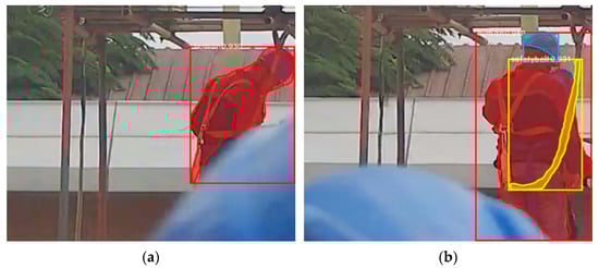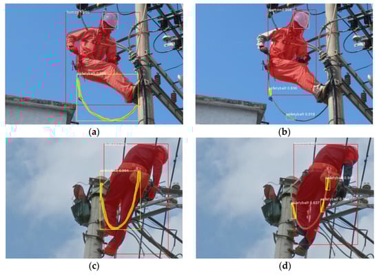 Moving occlusion often occurs in monitoring videos, blocking the target from being detected. The detector cannot detect the target correctly which affects the performance of the whole detection task. As shown in Figure 20, when a safety belt is occluded by a helmet, the features of the occluded part of the safety belt cannot be extracted which results in failure detection. Currently, we do not have an effective solution to this problem, and we can only perform correct detection of the target after the occlusion object has moved away from the video frame.
