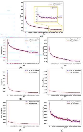 The loss function is employed to evaluate the dissimilarity between the ground truths and the predicted outputs in the training phase. The smaller the loss function value is, the better the model fitting effect and prediction performance are and the predicted outputs of the model are closer to the truth. The total loss of the proposed method consists of the RPN loss, and the four loss terms generated by the three functional branches. The total loss function is as follows: