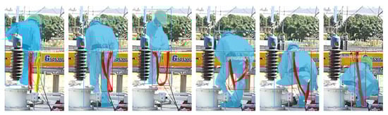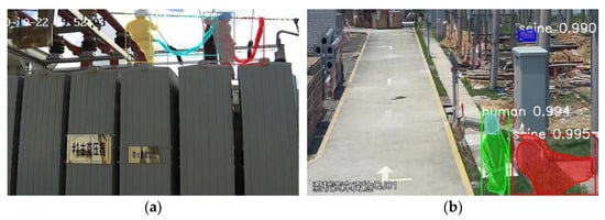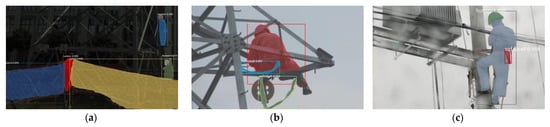 (1) Data Collection: The dataset of irregular deformable objects in the electric power operation scenes mainly included safety belts, seines and construction personnel. This work collected 6550 images from the power grid company. The pictures were mainly divided into two categories. The first category consisted of 5250 high-resolution images captured by field inspection personnel using the digital camera with a resolution of 5184 × 3888 pixels. The shooting angles of the pictures were horizontal and upward. The second category consisted of 1300 single-frame images captured from real-time monitoring videos of the power grid with resolutions of 1280 × 720 pixels and 1920 × 1080 pixels.