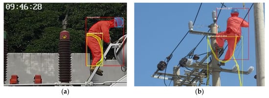 As society continues to develop, the electric power industry is making constant progress. Electric power operation has become an essential path for the development of power grid companies [1]. However, accidents frequently occur in electric power industry operations, resulting in casualties and economic losses. Therefore, ensuring the personal safety of construction personnel has become a key focus of research for power grid companies. According to the Power Safety Work Regulations [2] and the practical needs of electric power production [3], construction personnel are required to wear safety helmets at construction, maintenance, installation and aerial workplaces. In addition, when working at a height of more than 2 m from the ground, construction personnel must use safety belts [4]. In the electric construction workplace, the activities of construction personnel are difficult to control. In order to ensure the safety of personnel, safety seines are set up to restrict access to certain areas. However, some construction personnel violate the rules by crossing the safety seines to take shortcuts which can easily lead them into electrical hazard areas [5]. Furthermore, due to factors, such as hot weather and equipment, that cause inconvenience, construction personnel may not wear safety equipment properly, such as removing their safety helmets or not using safety belts. Therefore, in the safety management of electric construction workplace workers, it is particularly important to monitor the wearing of safety helmets and safety belts as well as regulate the violation of crossing safety seines.