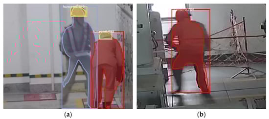 When objects move too quickly in monitoring videos, motion blur often occurs which affects the normal recognition and segmentation of the objects. As shown in Figure 19, the fast movement of construction personnel can lead to blurred edges of the human body contour, making it difficult to accurately measure the boundaries and size of the target. Moreover, the detailed information of the target in the blurred image is also blurred, and feature extractors often fail to extract this information correctly, resulting in reduced segmentation accuracy. To address the motion blur problem, we used data augmentation to simulate the blurring of monitoring videos by adding Gaussian noise, salt-and-pepper noise, etc. This increases the diversity and robustness of images and enhances the algorithm’s ability to detect edges in images by deforming and warping images to increase data diversity.