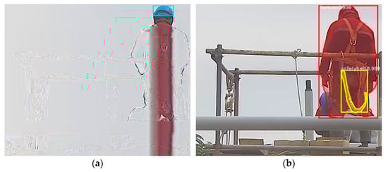 Detection for quickly moving personnel. The construction personnel in the blue box of (a) and the red box of (b) are both in motion.