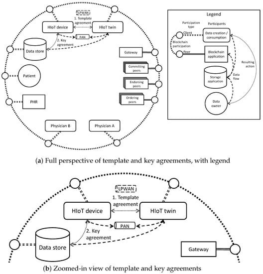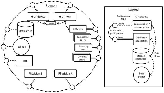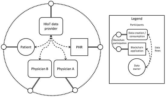 The primary difference between this and the prior work is that the data provider is a healthcare IoT solution, rather than an imaging centre. The collection of data is not concentrated into a single location but rather streamed in real-time, or close to it, from a wide area, using many individual sensor devices. The HIoT data provider contributes sensor data to the patient’s PHR and allows for any physician, authorised by the patient, to access them in order to provide them with healthcare services.
