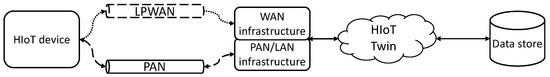 - Two communication methods between the device and its twin: one an LPWAN and one a PAN, where the LPWAN is low-bandwidth and possibly one-way, while the PAN is higher-bandwidth but intermittently available, for example, only when the patient visits a clinic.