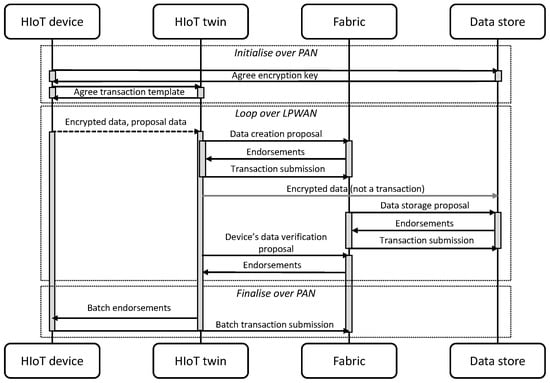 While the three-part early lifecycle approach (Section 4.1.2) increases transactions on the blockchain by 3× versus a single deferred transaction, the dispersal of endorsements helps to reduce bottlenecks in the system. At synchronisation time, endorsements have already been collected by the twin for the device to batch together, reducing the number of transaction submission messages to Fabric. Provided the synchronisation of all participating HIoT devices is not performed at the same time, excessive load should be avoidable.