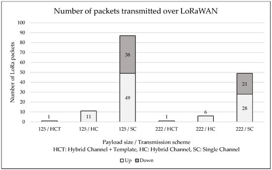Packets transmitted in both directions (uplink and downlink) for each transmission scheme, using two available payload size limits over LoRa.